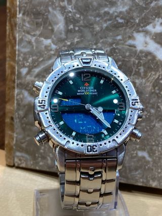 Reloj Citizen Promaster Worldtimer de los años 90 con una esfera verde esmeralda, hecho en Japon y comprado en Japon. Modulo C461 - Caja y brazalete de acero inoxidable. - Bisel giratorion unidirectional - Resistente al agua 100 metros. - Hora Digital y Analógico -Chronografó, calendario, GMT, Alarma Revisado en relojería en Noviembre de 2025 : - Limpieza, pila, juntas, Botón Pulsantes, Estanqueidad. El reloj viene con todos los Eslabones. Envío con Wallapop.