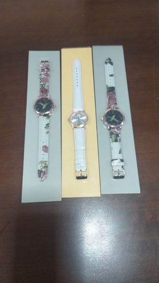 Conjunto de tres relojes con diseños únicos y correas estampadas. - Correa con estampado floral. - Correa lisa blanca. Precio: 10 € cada uno