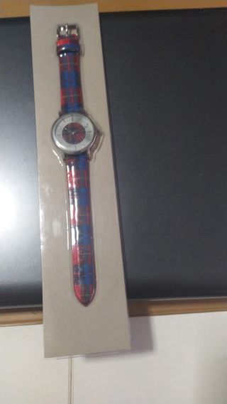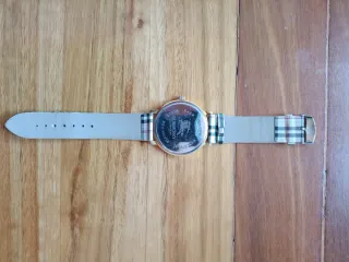 Elegante reloj analógico con un diseño clásico y distintivo. - Correa con estampado de cuadros característico. - Esfera redonda con detalles dorados. No probado, hay que cambiarle la pila.