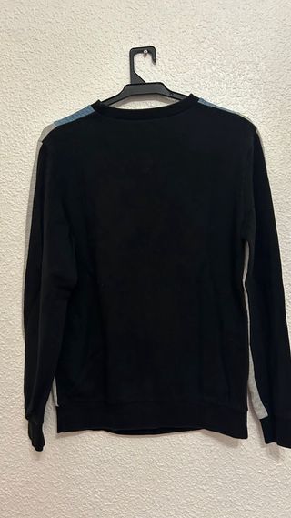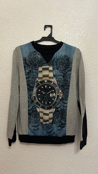 Sudadera con un diseño llamativo en el frontal. - Estampado de reloj grande. - Mangas grises y laterales negros. - Cuello redondo.