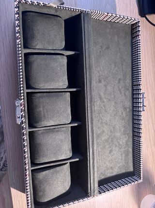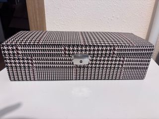 Elegante caja para guardar y organizar relojes. Su diseño interior cuenta con compartimentos acolchados para proteger tus piezas. - Diseño de 5 compartimentos. - Revestimiento interior de terciopelo. - Exterior con estampado de pata de gallo.