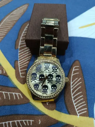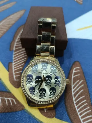 Elegante reloj de la marca Mark Maddox con un diseño llamativo. - Esfera con estampado de calaveras. - Bisel adornado con pequeñas piedras. - Correa metálica dorada.