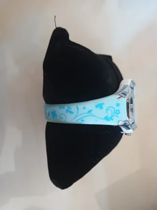 Reloj de pulsera con un diseño floral. - Correa de silicona azul con estampado floral. - Esfera blanca con detalles plateados y números. - Bisel plateado.