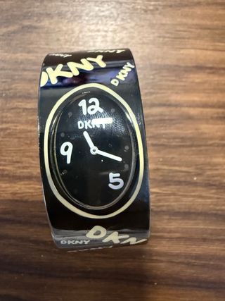 Elegante reloj de pulsera DKNY para mujer. - Diseño con esfera negra. - Detalles en color dorado. - Pulsera con estampado de la marca.