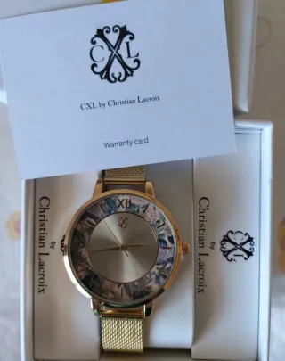 Elegante reloj de pulsera con un diseño llamativo. - Esfera con estampado floral y detalles en dorado. - Correa de malla metálica dorada. - Cierre ajustable.