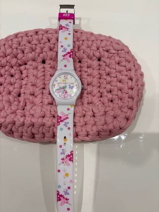 Reloj infantil con un divertido diseño de unicornios y mariposas. - Correa blanca con estampado de unicornios. - Hebilla con detalle rosa. - Esfera con números y dibujos.