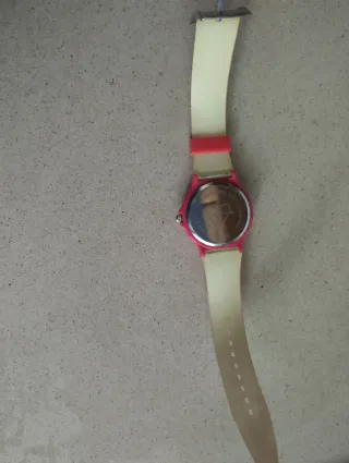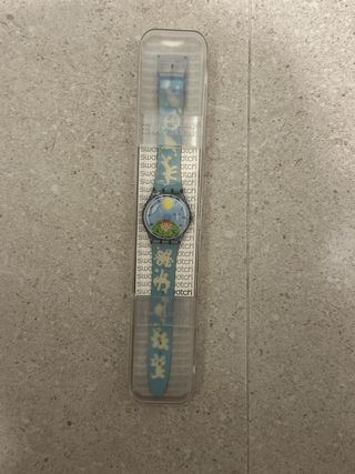 Reloj infantil de la marca Swatch con un diseño divertido y colorido. Perfecto para los más pequeños. - Correa con estampado de flores y elementos de la naturaleza. - Esfera con ilustración de un niño y el sol. Hay que cambiarle la pila.