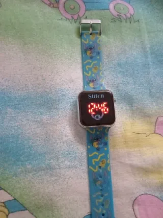 Reloj digital con diseño de Stitch de Disney. La correa es de color azul con un estampado divertido del personaje. - Correa con estampado de Stitch. - Hebilla plateada.