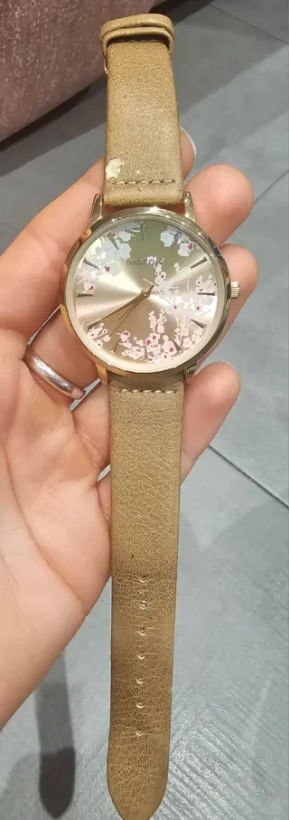 Elegante reloj de pulsera con un diseño floral. - Esfera con estampado de flores. - Correa de piel. - Detalles en tono dorado.