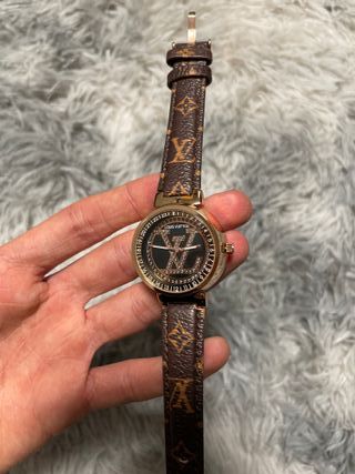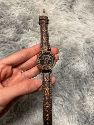 Elegante reloj con correa de cuero y detalles dorados. - Correa con estampado clásico de la marca. - Esfera con diseño distintivo.