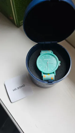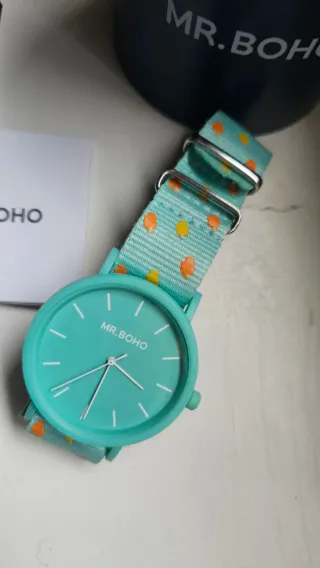 Reloj de pulsera de la marca Mr Boho. - Color turquesa. - Correa de tela con estampado. - Incluye caja original. -Aun tiene pila.