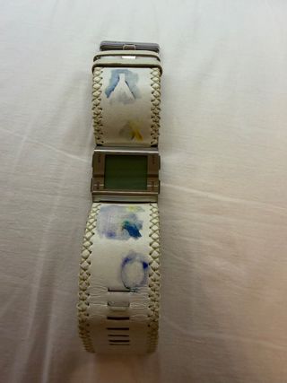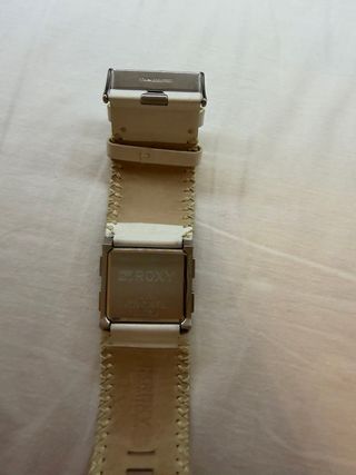 Reloj Roxy con correa blanca y un diseño artístico. - Correa de cuero blanco con costuras decorativas. - Estampado floral en tonos azules y amarillos. - Hebilla metálica. No tiene pila. Entrega en mano.