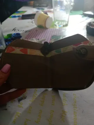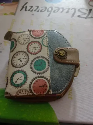 Cartera monedero con un diseño original y llamativo. - Estampado de relojes en tonos pastel. - Cierre de botón a presión. - Detalle metálico en el cierre.