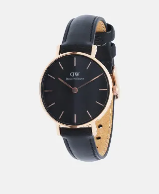 Elegante reloj de pulsera Daniel Wellington con correa de piel. - Caja de color dorado. - Correa de piel negra con textura. - Esfera blanca con detalles dorados.