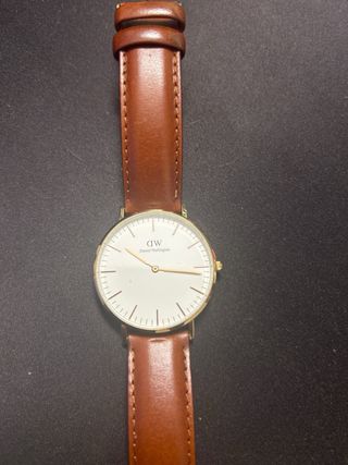 Elegante reloj Daniel Wellington con correa de cuero marrón y detalles dorados. - Esfera blanca con marcadores horarios. - Correa de cuero genuino. - Caja de acero inoxidable. Con correa extra totalmente nueva No funciona la pila. Solo correa 30€
