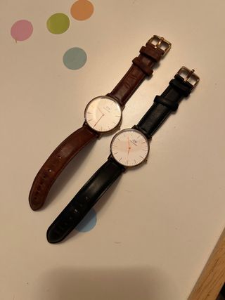 Se venden dos relojes Daniel Wellington, uno con correa marrón y otro con correa negra. Ambos relojes tienen una esfera clara y detalles dorados. - Correa de cuero marrón. - Correa de cuero negro. - Esfera redonda. - Cierre de hebilla.
