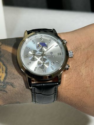 Reloj Benyar de estilo elegante y deportivo, ideal para uso diario o para vestir. Cuenta con correa de cuero marrón muy cómoda y caja negra que le da un aspecto moderno y masculino. La esfera negra incluye cronógrafos decorativos, indicadores claros y ventana de fecha, ofreciendo un diseño inspirado en relojes de gama alta. ✔ Caja de acero inoxidable ✔ Resistente al agua 30M (salpicaduras, lavado de manos) ✔ Cristal resistente ✔ Correa de cuero marrón estilo vintage ✔ Diseño elegante y deportivo El reloj está en buen estado, con signos normales de uso en la correa, pero funcionando correctamente. Perfecto para quien quiera un reloj