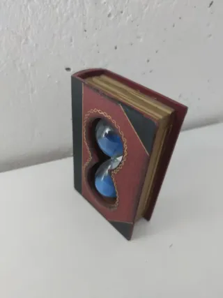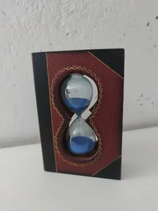 Este artículo decorativo tiene la forma de un libro antiguo con un reloj de arena en su interior. - Diseño de libro con detalles dorados. - Reloj de arena con arena azul.