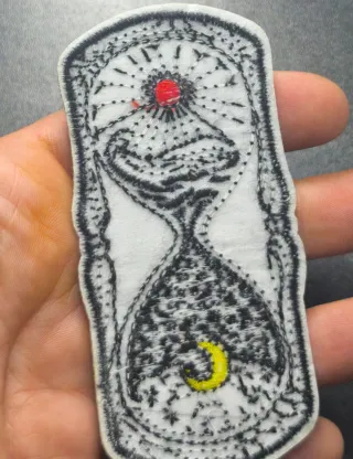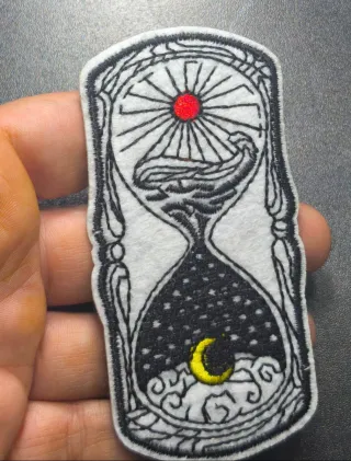 Parche bordado con un diseño único de reloj de arena. - Representa el sol en la parte superior. - Muestra la luna y estrellas en la parte inferior. - Borde negro con detalles blancos. Solo envios