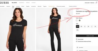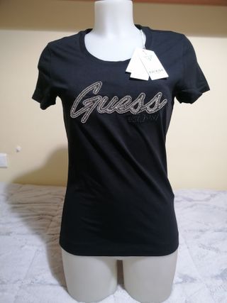 Preciosa camiseta GUESS con piedrecitas de joyería con brillitos tipo diamantes. Cuando da el sol hace brillitos que quedan muy bellos y elegantes. Además tiene un corte muy favorecedor en forma de reloj de arena con la cintura estrecha. Son ceñidas. Y como no tiene estampado no se estropeará con los lavados.