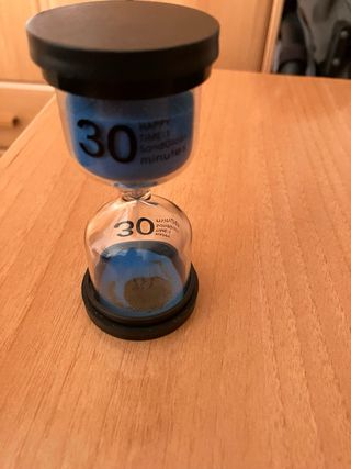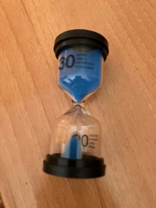 Este reloj de arena es perfecto para medir tiempos de 30 minutos. Su diseño es moderno y funcional. - Arena de color azul. - Estructura de plástico negro y cristal.