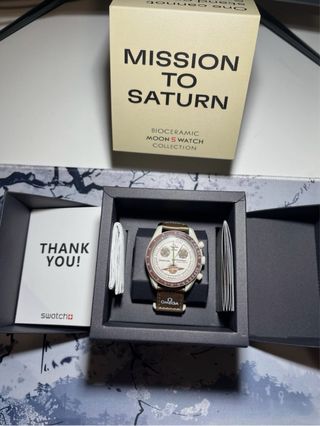 Omega × Swatch MoonSwatch "Mission to Saturn" nuevo en perfecto estado. Incluye caja, bolsa y correa (beige/arena). Es un modelo muy buscado dentro de la colección Bioceramic MoonSwatch, ideal para coleccionistas y aficionados a la relojería. Lo vendo porque fue un capricho y al final no lo voy a usar, pretiero que lo disfrute otra persona. Más fotos por privado. Precio negociable, solo venta. Respondo rápido, pregunta sin compromiso.