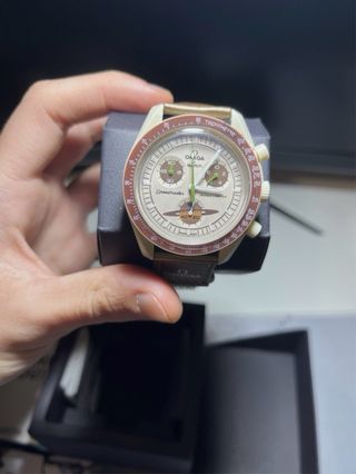 🚀 Omega x Swatch 🪐 Mission to Saturn 🧱 Caja de biocerámica color arena 🎯 Cronógrafo de cuarzo 🪐 Esfera exclusiva Saturn 🎨 Detalles marrones 📏 Tamaño cómodo y ligero 📦 Caja y documentación ✨ Sin estrenar 💬 Entrega en mano