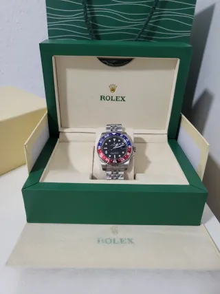 Reloj automático de lujo Rolex GMT-Master II. - Bisel con dos tonos, rojo y azul. - Esfera negra. - Brazalete de acero inoxidable.