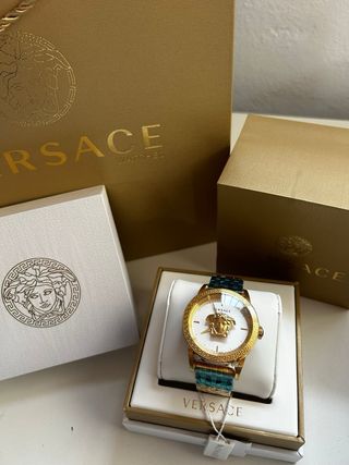 Reloj Versace original ⌚✨ Diseño elegante en tono dorado con icónico Medusa en relieve 🐍💛 Correa metálica con protectores aún puestos 🔒 Estado impecable, con caja y documentación 📦✅ Ideal para lucir estilo y lujo en cualquier ocasión 😎💎