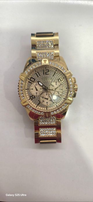 Reloj Guess original, cronógrafo, acabado en dorado y decorado con cristales Swarovski auténticos, que aportan un brillo elegante y muy llamativo. Diseño sofisticado y de gran presencia, ideal tanto para ocasiones especiales como para elevar cualquier look diario. Funciona perfectamente y se encuentra en muy buen estado, bien cuidado. Se entrega con caja original Guess, ideal también como regalo. Un reloj de marca reconocida, con estética de lujo, a un precio muy inferior al de tienda.