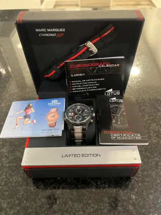Reloj de edición limitada de Marc Márquez con diseño Chrono GP. - Caja y correa en tonos negro y plateado. - Esfera con detalles deportivos. - Incluye manual de instrucciones y certificado de garantía. -Usado muy poco. -Correa deportiva sin estrenar.