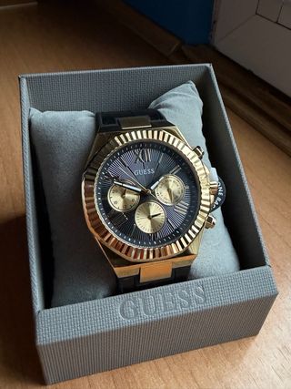 Elegante reloj de la marca Guess con detalles en dorado y correa negra. Presentado en su caja original. - Diseño con múltiples esferas. - Bisel texturizado. - Caja de presentación incluida.