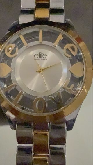 Elegante reloj de la marca Elite con un diseño bicolor que combina tonos dorados y plateados. Un accesorio con estilo. - Diseño con la palabra LOVE y corazones. - Esfera con acabado satinado.