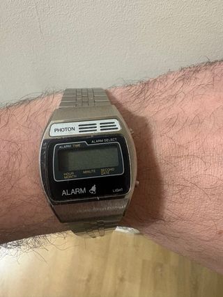 Reloj digital vintage de la marca Photon. Un accesorio clásico con un diseño atemporal. - Correa de metal plateado. - Pantalla digital. - Funciones de alarma y luz.