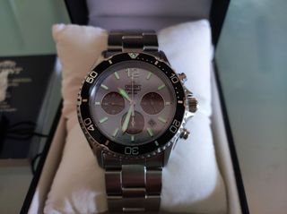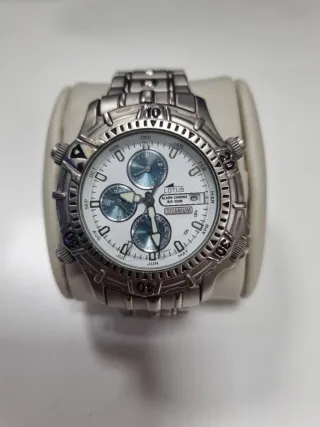 Reloj Orient con cronógrafo y resistencia al agua de 200 metros. - Esfera azul claro - Bisel negro. - Correa de acero inoxidable. Se vende con instrucciones,caja,garantía con factura comprado en marzo 2025 Como nuevo,sin marcas de uso No Seiko no citizen