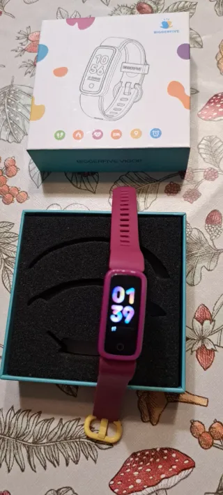 Reloj inteligente para niños de la marca Biggerfive. Con la caja e instrucciones. Es relog, marca pasos, lee las pulsaciones. Se carga como un movil Poco uso. Único detalle un pico descolorido del relog, en la penultima foto se ve. - Correa de color rosa. - Hebilla de cierre en color amarillo.
