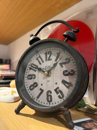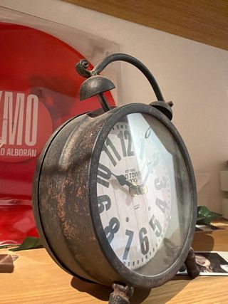 Reloj de mesa con un diseño vintage y efecto desgastado que añade un toque de carácter a cualquier espacio. - Esfera con números grandes y fáciles de leer. - Marco metálico con acabado envejecido.