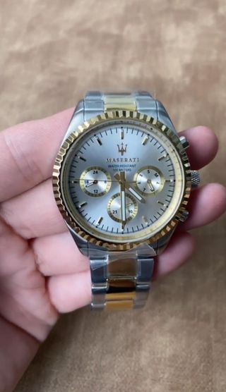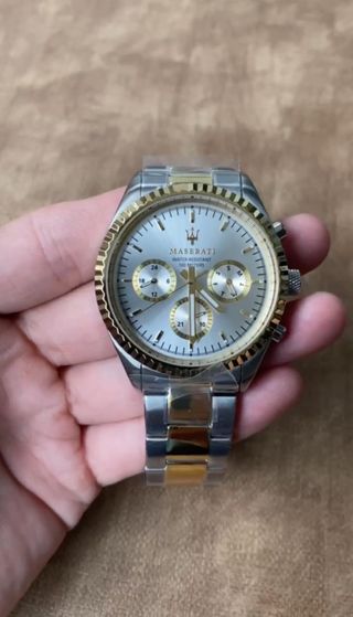 Elegante reloj Maserati con un diseño bicolor que combina tonos dorados y plateados. Su esfera presenta detalles distintivos de la marca. - Bisel con acabado dorado. - Correa de eslabones en acero inoxidable. - Tres subesferas en la pantalla principal.