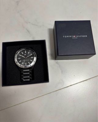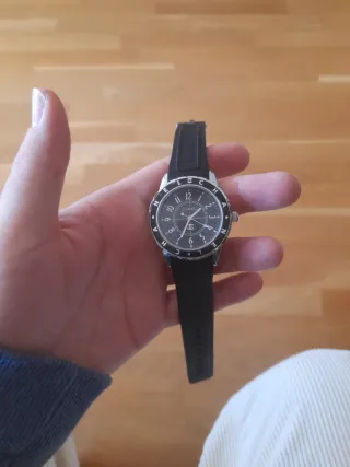 Elegante reloj de pulsera con un diseño moderno. - Caja y correa en tonos negro y plateado. - Esfera con detalles distintivos de la marca.