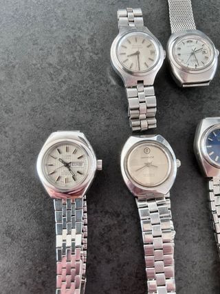 Conjunto de cuatro relojes de pulsera para mujer. - Relojes de marcas reconocidas. - Diseños variados en tonos plateados y uno en azul. - Brazaletes metálicos. 5 relojes para mujer. -Bulova (no funciona) - Orient (no funciona) - Titan - Sandoz - Citizen