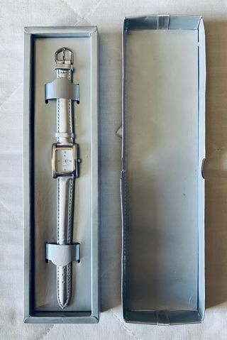 Elegante reloj de pulsera con correa plateada. - Caja rectangular metálica. - Correa de piel sintética con pespuntes. - Cierre de hebilla plateada.
