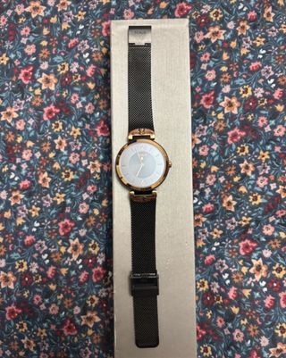 Elegante reloj de la marca Guess con detalles dorados y esfera azul. - Diseño moderno y sofisticado. - Caja original incluida. - Función calendario,fecha,cronómetro. - Correa de cuero, resistente al agua 5bar, peso 83g - Usado una vez