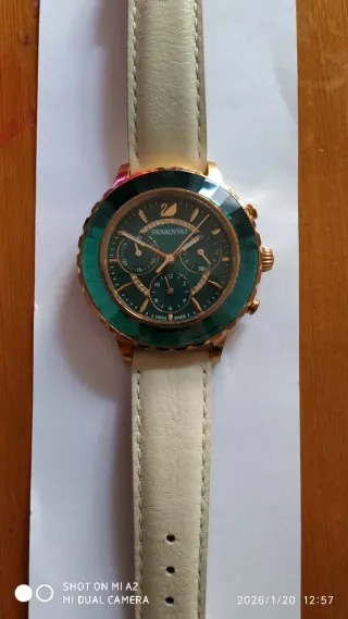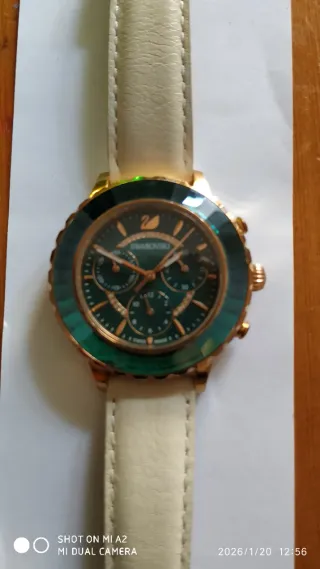 Elegante reloj de la marca Swarovski con un diseño sofisticado. - Bisel con detalles en verde. - Correa de piel en tono claro. - Detalles en tono dorado en la esfera.