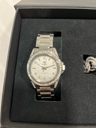 Elegante conjunto de reloj y pulsera de la marca Marea. - Diseño en tono plateado. - Detalles brillantes alrededor de la esfera del reloj - diseño de la pulsera de aros entrelazados