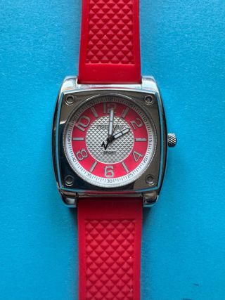 Reloj de la marca Pertegaz con una llamativa correa roja y detalles plateados. - Diseño moderno y deportivo. - Correa de silicona texturizada. - Esfera interior redonda con detalles en rojo. - Caja plateada cuadrada Caja Cuadro interior: 35 mm Caja exterior con enganches: 45 mm