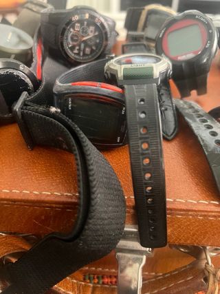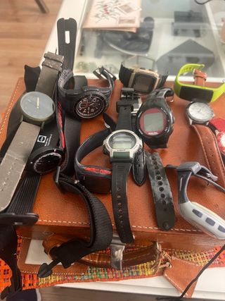 Conjunto de relojes de diferentes estilos y marcas. - Reloj analógico con esfera negra. - Reloj digital con pantalla LCD. - Reloj deportivo con correa de silicona. - Reloj con correa de cuero. Todos funcionaban pero se acabaron las pilas y a algunos les falta o esta rota la correa
