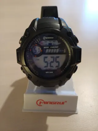Reloj deportivo digital de la marca Mingrui. Su diseño es robusto y funcional. Unisex. - Correa de material sintético. - Pantalla digital con números grandes. - Resistente al agua WR 30M.