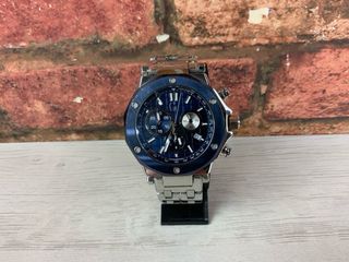 Elegante reloj para hombre de la marca Boss. Su diseño combina tonos azules y plateados, ideal para complementar tu estilo. - Esfera azul con detalles plateados. - Correa de eslabones plateada. No funciona el cronógrafo El cojín de las fotos no está incluido Tiene eslabones de sobra