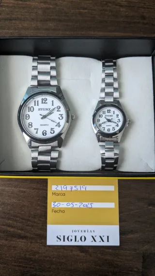 Conjunto de dos relojes de la marca Hyunx - Diseño elegante con detalles plateados y esfera blanca. - Brazalete metálico. - Uno de hombre, más grande, otro de mujer, más fino - Ideal para regalar - Completamente nuevos a estrenar - Con su certificado