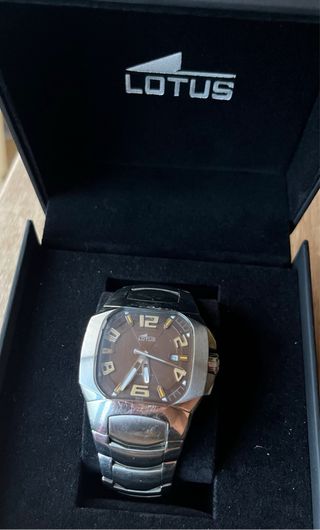 Elegante reloj Lotus para hombre, con caja y brazalete de acero. - Diseño moderno con esfera marrón. - Detalles plateados en el brazalete y la caja. Funciona y está en buen estado pero tiene marcas de uso.
